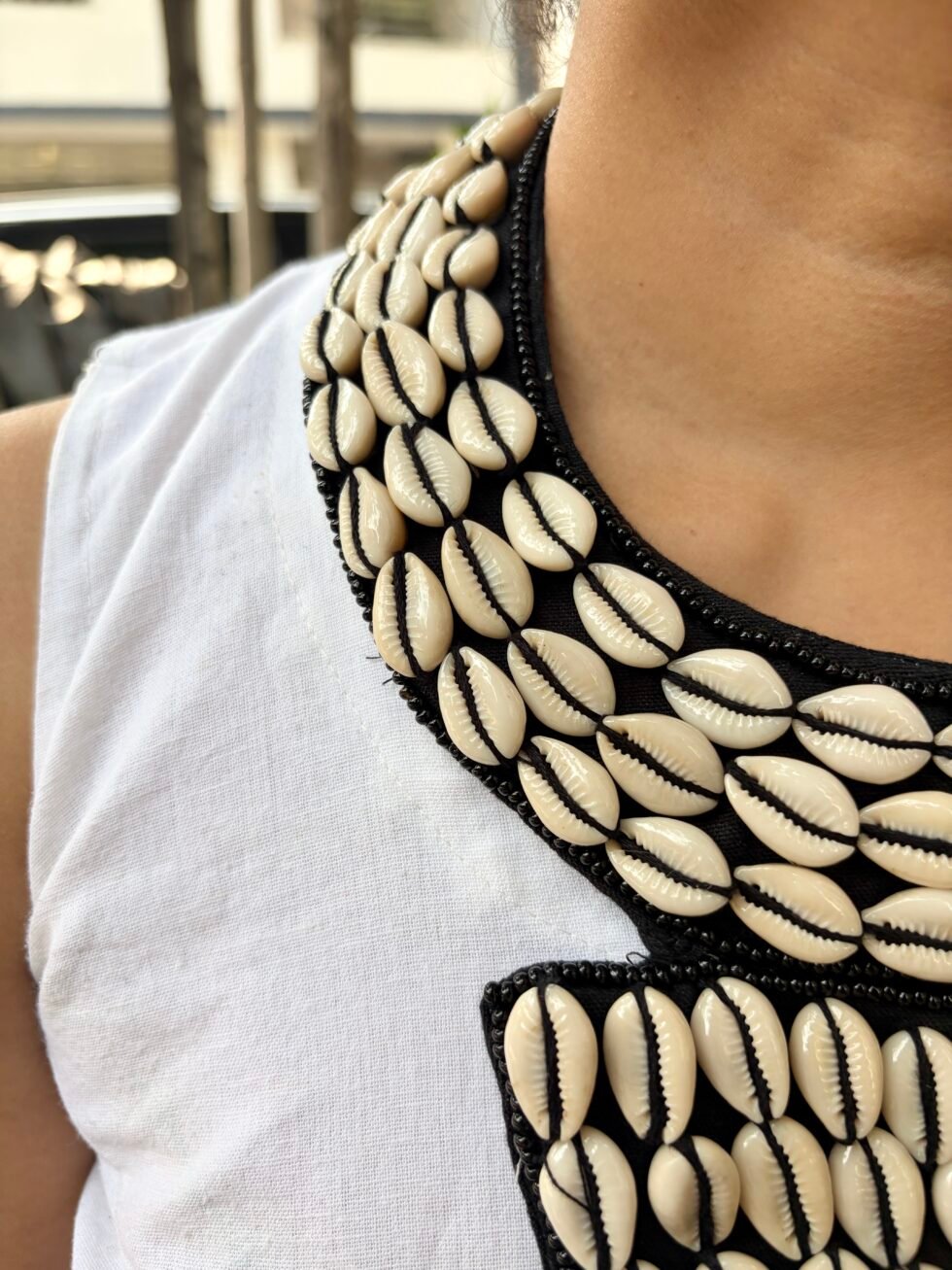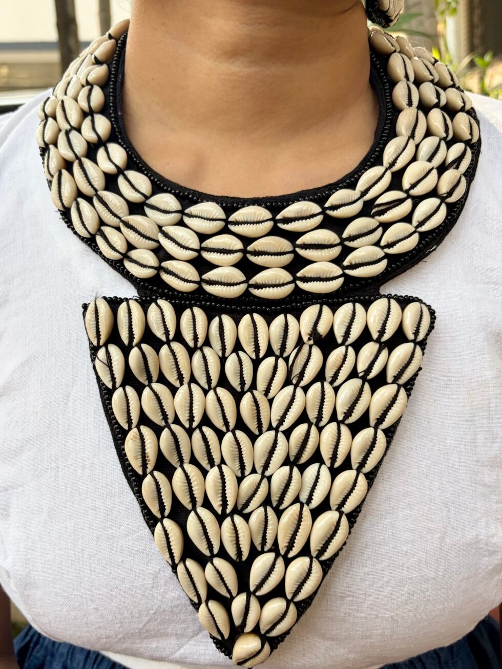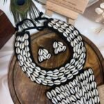 Bring bold handmade beauty to your festive wardrobe with this stunning black cowrie shell statement jewelry set. Designed for women who love artistic accessories with strong personality, this set beautifully combines rows of white cowrie shells on a rich black base for a look that feels striking, stylish, and full of handcrafted charm. The contrast of black and white gives it a timeless boho appeal, while the coordinated pieces make the full styling look more complete and thoughtfully put together. It is the kind of handmade set that instantly catches attention and makes even a simple outfit feel special.