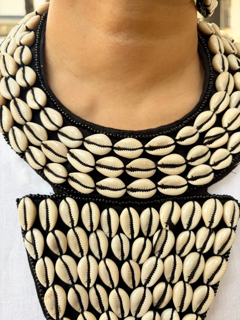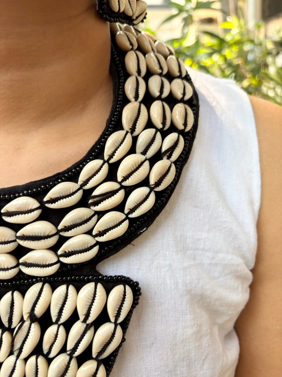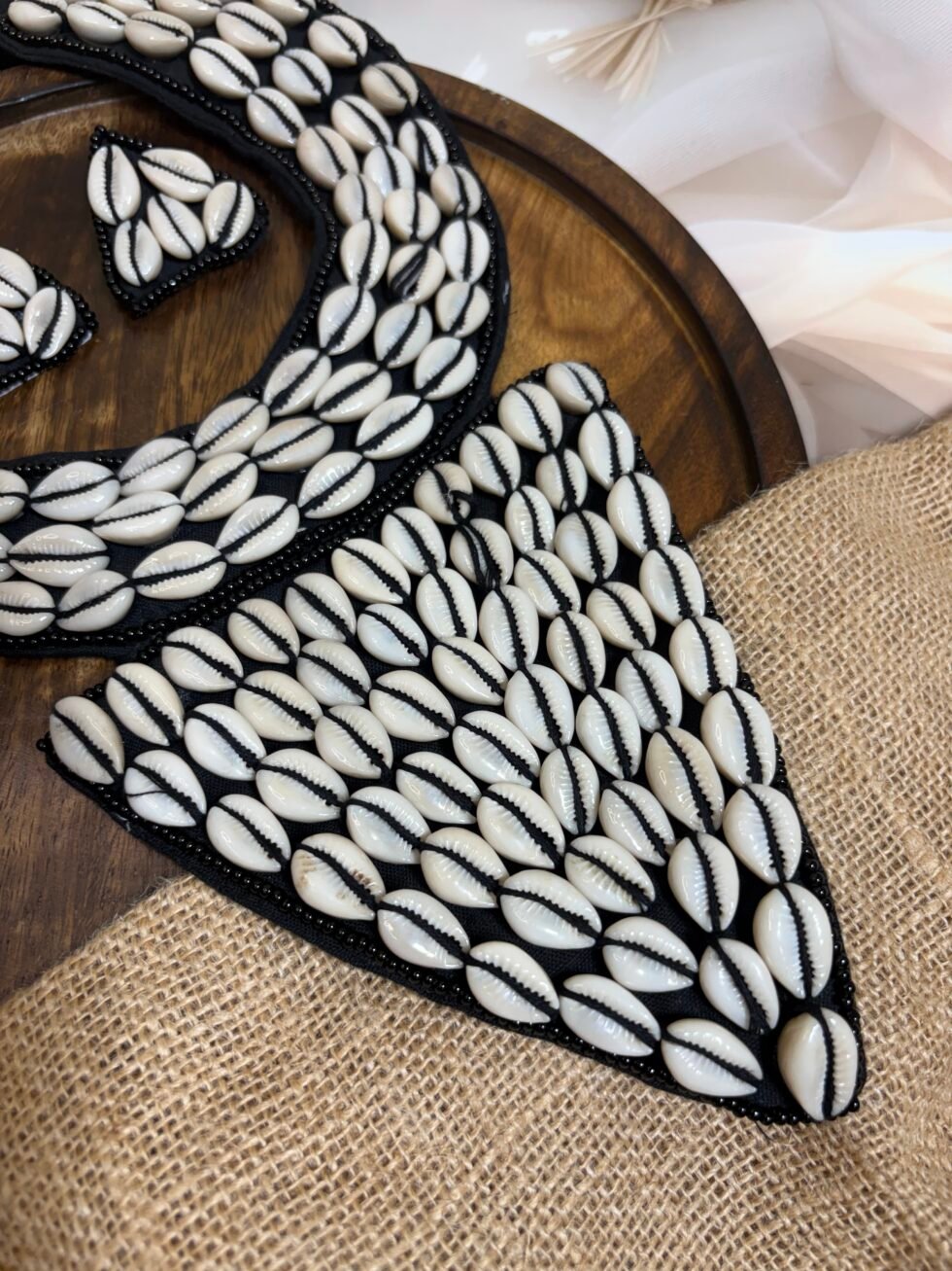 • Handmade cowrie shell statement jewelry set with bold black base