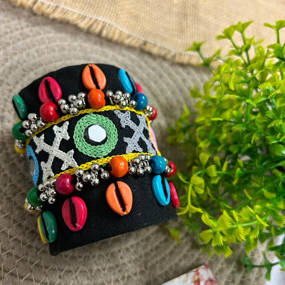 Add a bold handmade touch to your festive styling with this beautiful black mirror work cuff bracelet, created for women who love accessories with strong personality and visible craft value. This statement piece combines a rich black base with colorful embellishments, mirror accents, shell-style details, and tiny metallic decorative touches that make it feel joyful, artistic, and celebration-ready. The black background makes every color stand out even more, giving the bracelet a striking festive look that feels both playful and stylish. It is the kind of accessory that can instantly turn a simple outfit into something much more expressive and memorable.