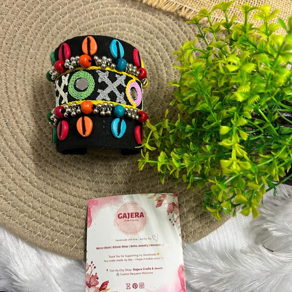 This handmade cuff is perfect for Navratri nights, garba looks, mehendi functions, haldi celebrations, festive gatherings, cultural events, vacations, and creative Indo-western styling. It pairs beautifully with lehenga, chaniya choli, saree, kurtis, dresses, co-ord sets, kaftans, and fusion outfits where one bold bracelet can become the highlight of the full look. The colorful accents bring energy and freshness, while the mirror work adds festive sparkle without making the design feel too heavy. Handmade with care, this piece feels artistic, wearable, and premium in a way that supports long-term brand trust.