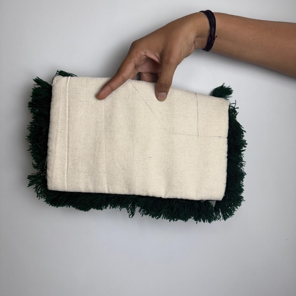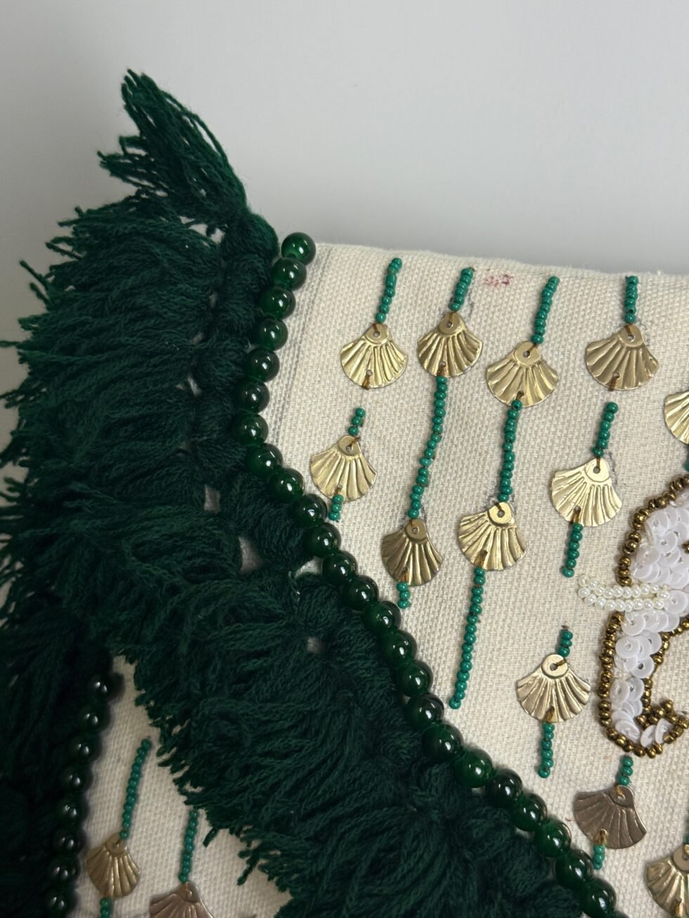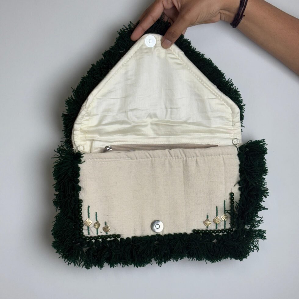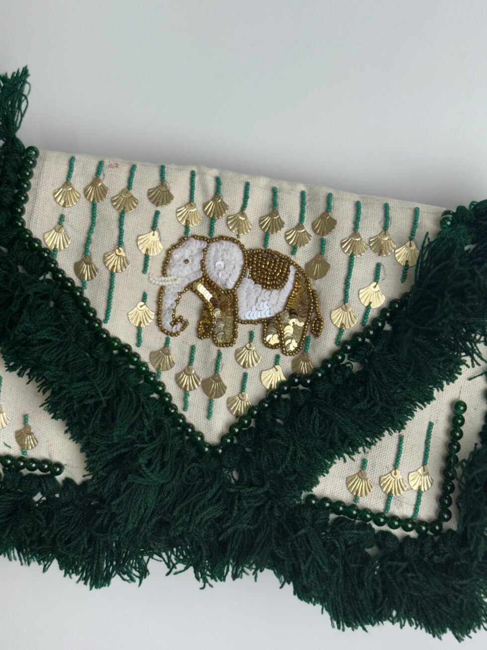Bring festive charm and handcrafted elegance to your look with this handmade green tassel elephant clutch bag. Designed for women who love accessories with visible craft value, this bag beautifully combines a graceful elephant motif, rich green tassel border, bead accents, and delicate decorative detailing on a soft fabric base. The overall look feels artistic, festive, and full of personality, making it a lovely choice for women who want something different from regular market bags. The elephant design adds a traditional and graceful Indian touch, while the deep green tassels make the piece look bold, stylish, and celebration-ready.