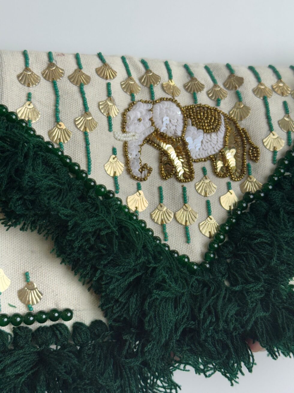 • Handmade clutch bag with elegant elephant embroidery and rich green tassel detailing