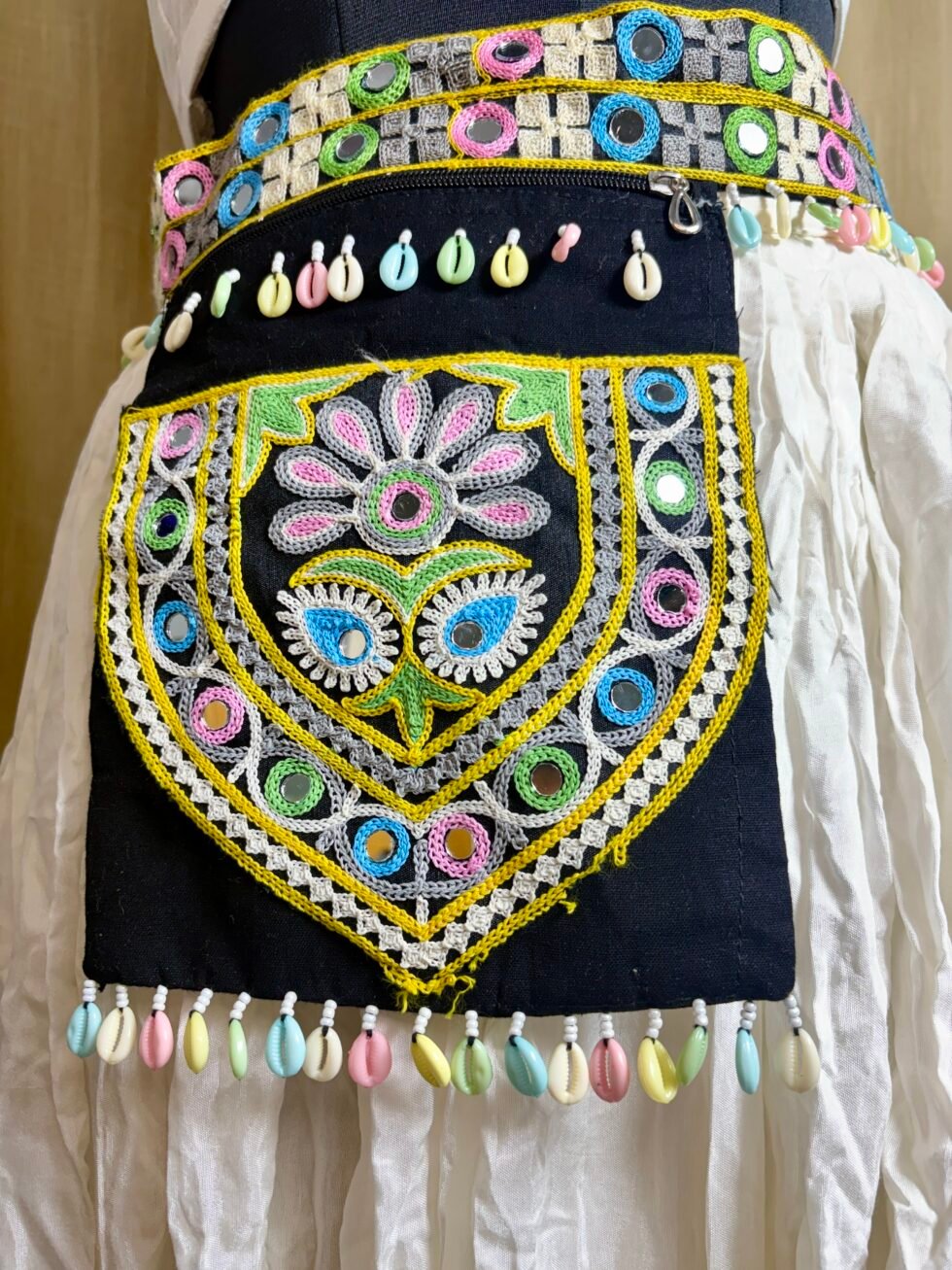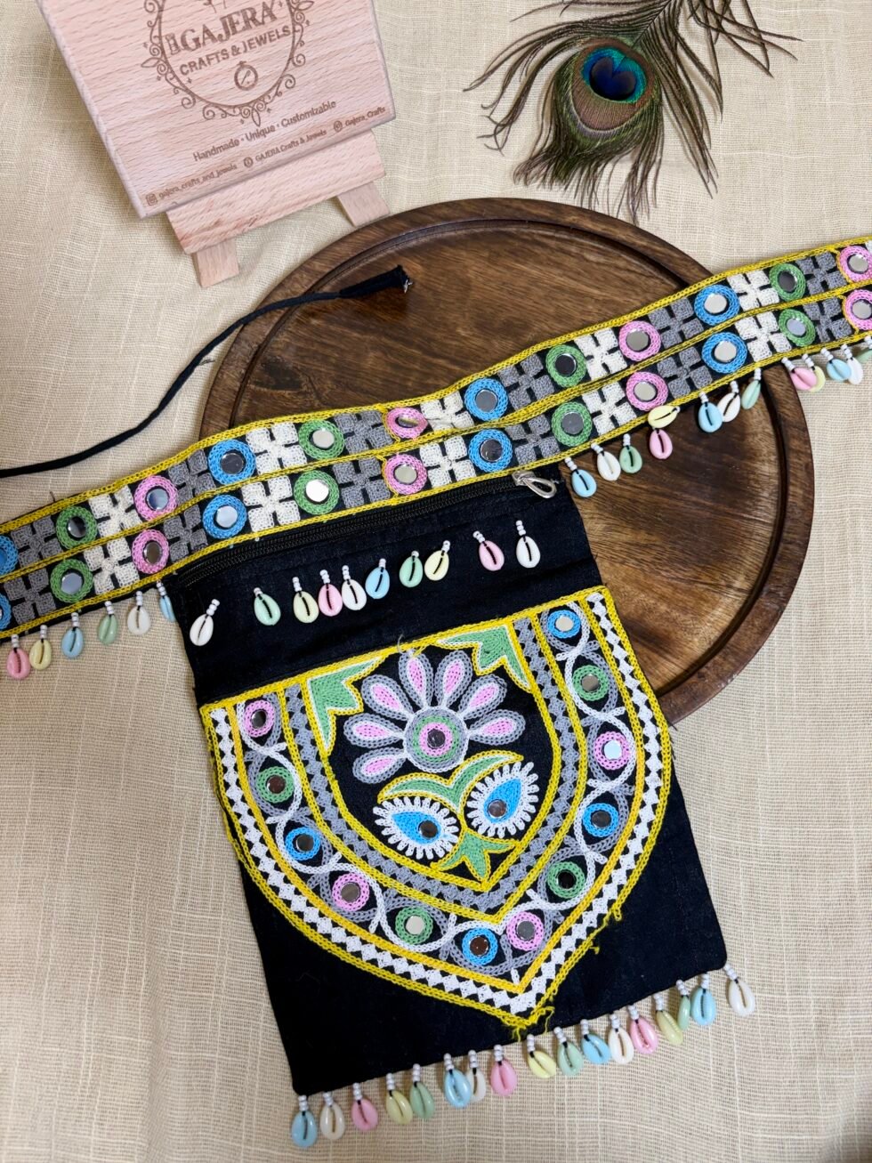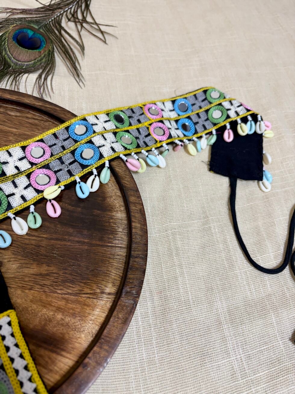 Add color, craft, and festive charm to your look with this handmade black pastel mirror work kamarbandh and matching pouch set. Designed for women who love coordinated accessories with visible artisan beauty, this set beautifully combines a deep black base with soft pastel mirror accents, floral folk-inspired embroidery, and delicate shell hangings. The result is a look that feels festive, artistic, and stylish at the same time. The black background helps the pastel shades stand out beautifully, giving the full set a fresh and eye-catching appeal that feels both traditional and modern.