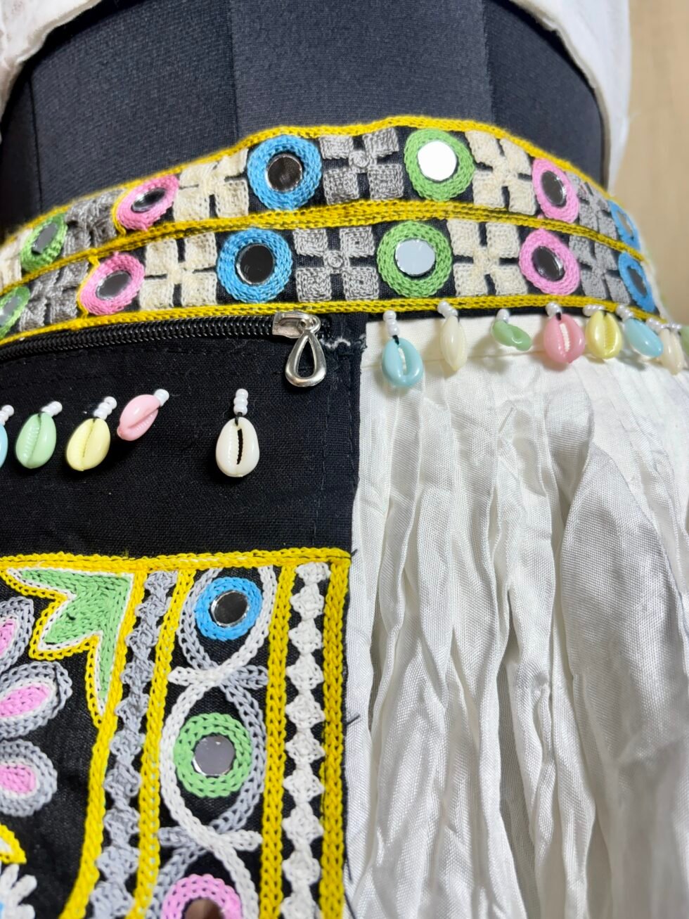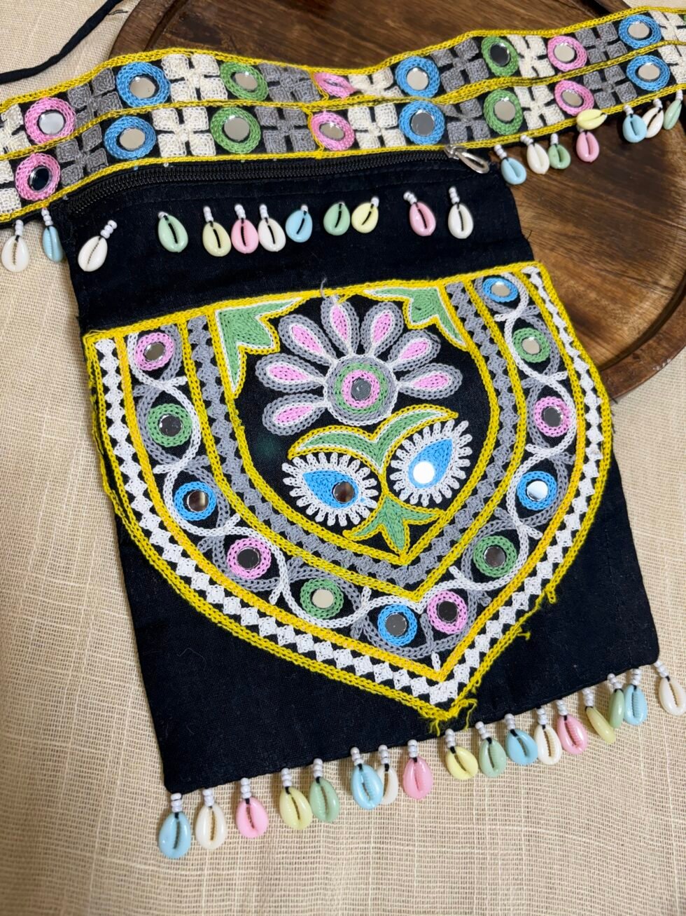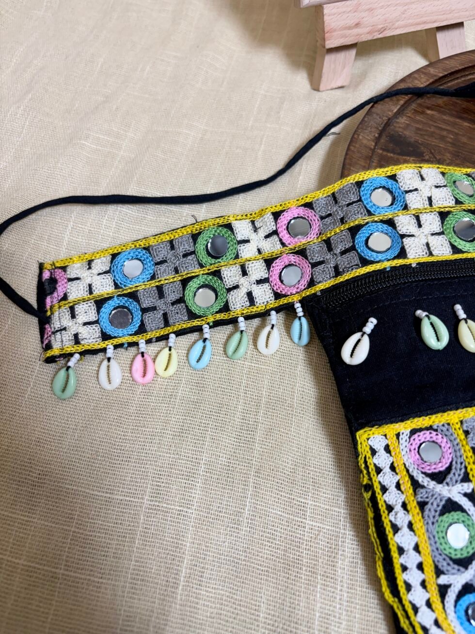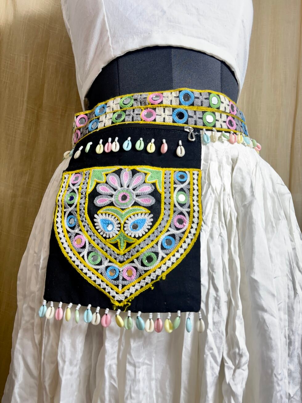 Add color, craft, and festive charm to your look with this handmade black pastel mirror work kamarbandh and matching pouch set. Designed for women who love coordinated accessories with visible artisan beauty, this set beautifully combines a deep black base with soft pastel mirror accents, floral folk-inspired embroidery, and delicate shell hangings. The result is a look that feels festive, artistic, and stylish at the same time. The black background helps the pastel shades stand out beautifully, giving the full set a fresh and eye-catching appeal that feels both traditional and modern.