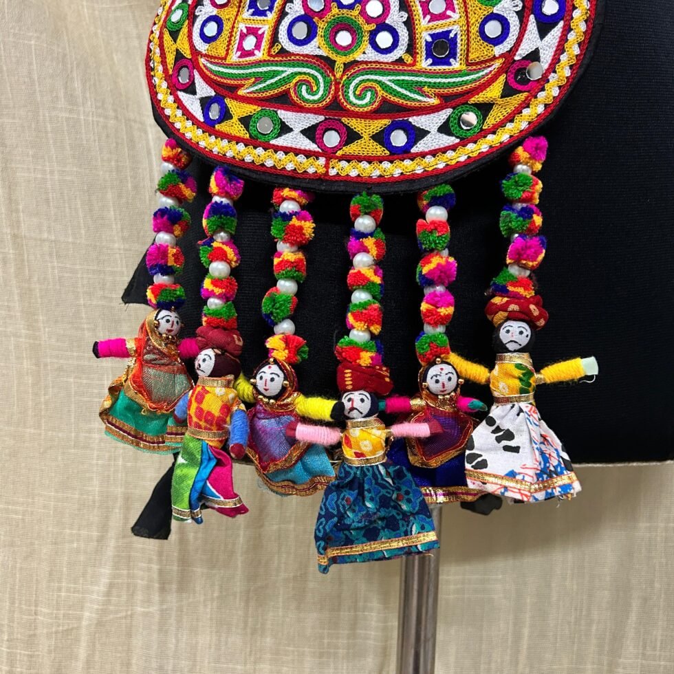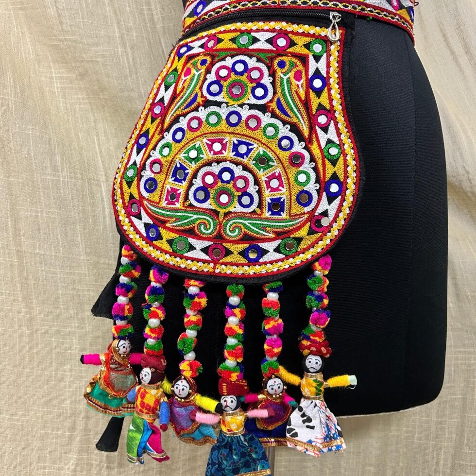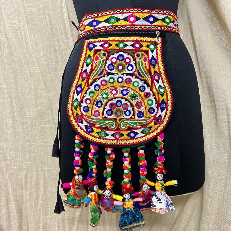 This kamarbandh bag is perfect for Navratri nights, garba looks, mehendi functions, haldi celebrations, festive gatherings, folk events, cultural programs, and creative Indo-western styling. It pairs beautifully with lehenga, chaniya choli, saree, skirt, kurti, blouse, and fusion outfits where one statement accessory can complete the whole look. The attached pouch adds practical value for carrying small essentials, while the colorful doll tassels bring movement and artisan charm. Handmade with care, this piece feels memorable, festive, and premium in a way that supports long-term brand trust and festive relevance in the Indian market.