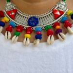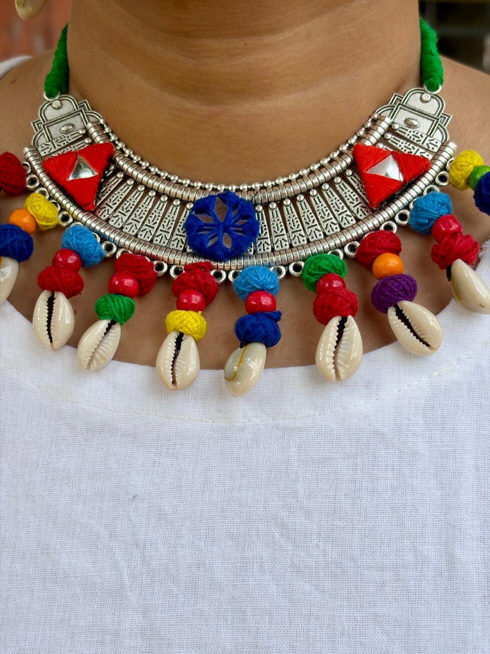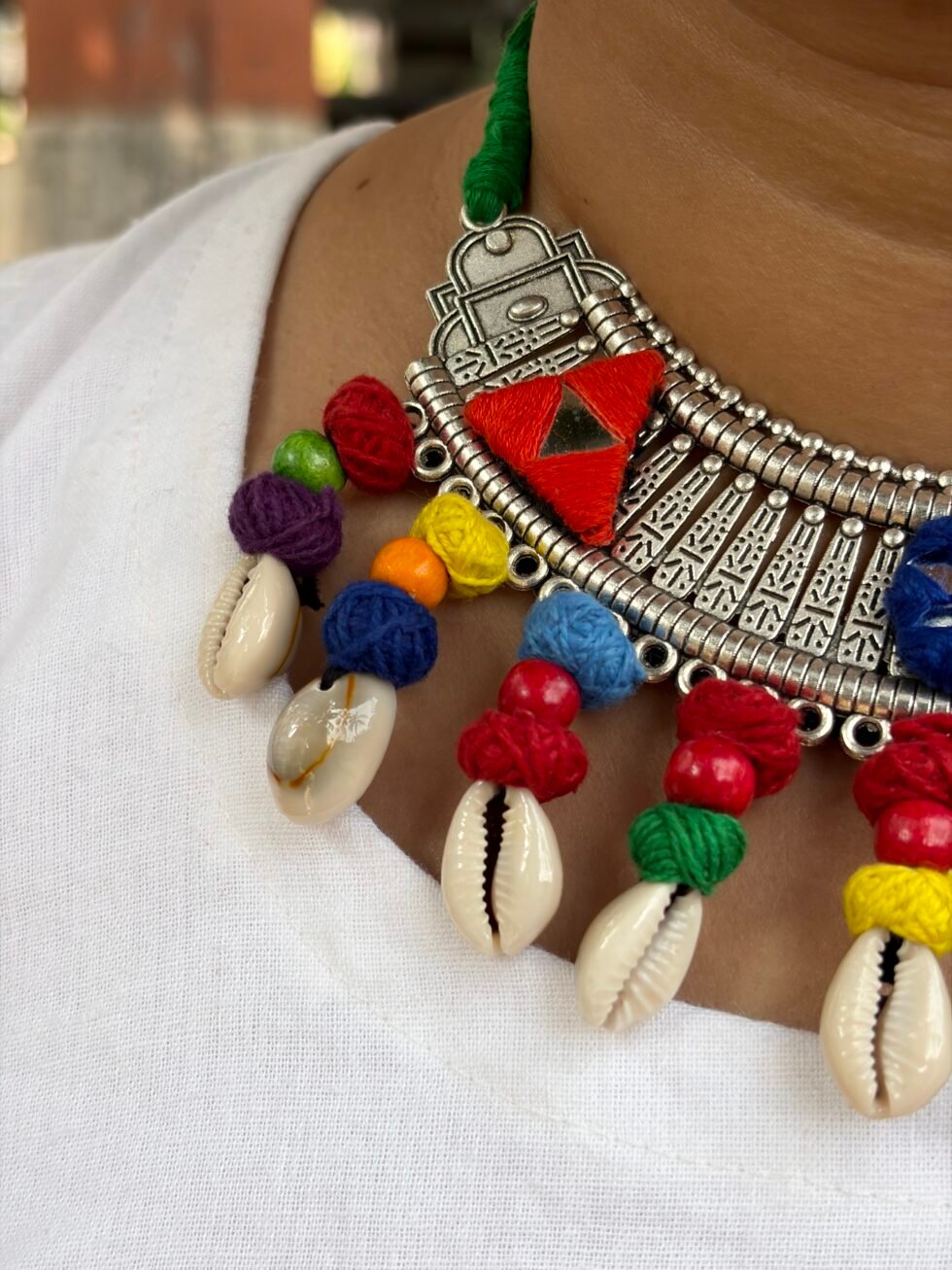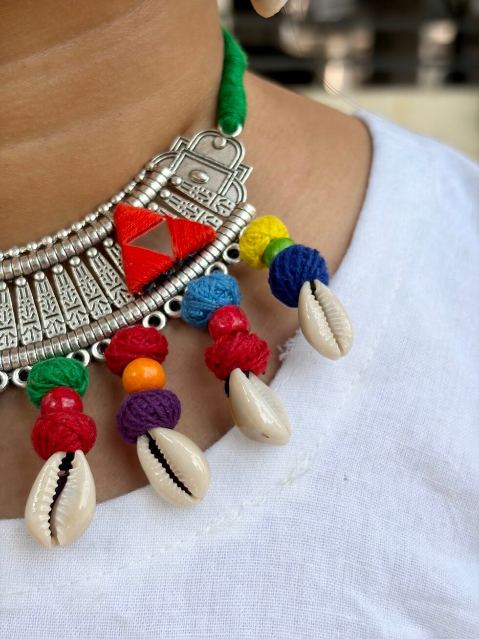 Add vibrant energy and handcrafted beauty to your festive wardrobe with this handmade multicolor cowrie shell oxidised choker necklace. Designed for women who love jewelry that feels artistic, lively, and different from regular market pieces, this neckpiece beautifully combines colorful thread-wrapped beads, natural cowrie shell hangings, and a bold oxidised pendant-style center. The result is a striking statement look that feels rooted in Indian festive style while also carrying a playful boho character. It is the kind of necklace that instantly lifts a simple outfit and gives it personality, color, and handcrafted charm.
