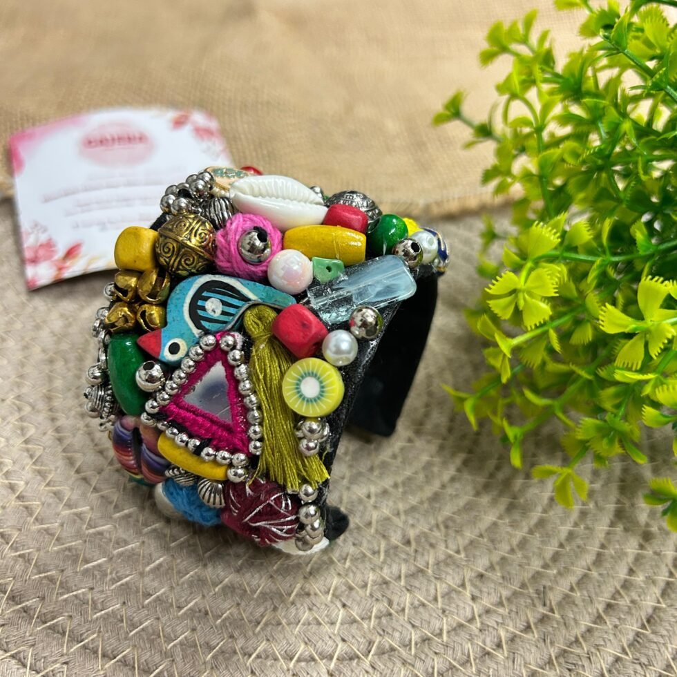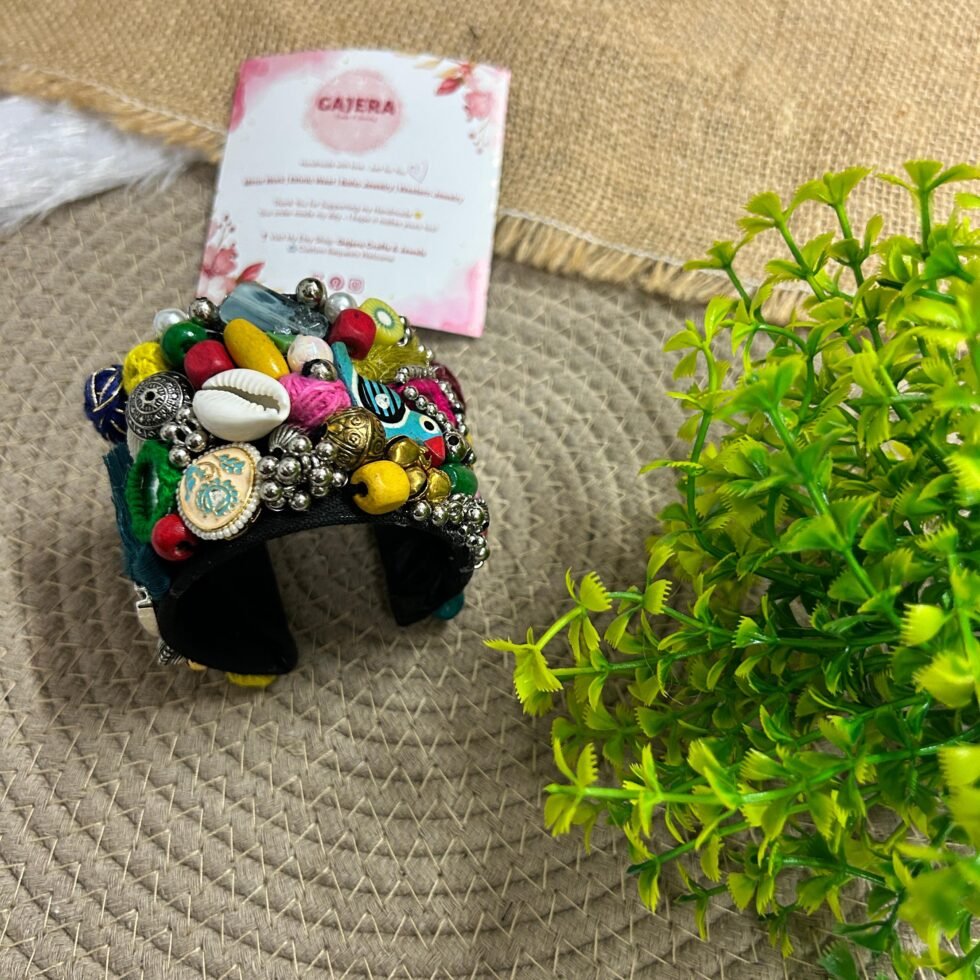Add a bold handmade touch to your festive styling with this multicolor statement cuff bracelet, created for women who love accessories with strong personality and visible craft value. This piece beautifully combines a rich black base with colorful beads, shell accents, mirror-style elements, metallic details, and playful artisan embellishments that make it feel joyful, artistic, and celebration-ready. Every detail adds texture and character, giving the bracelet a vibrant handcrafted look that stands out beautifully. It is the kind of accessory that can instantly make even a simple outfit look more expressive, creative, and memorable.