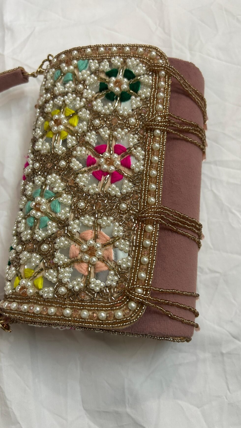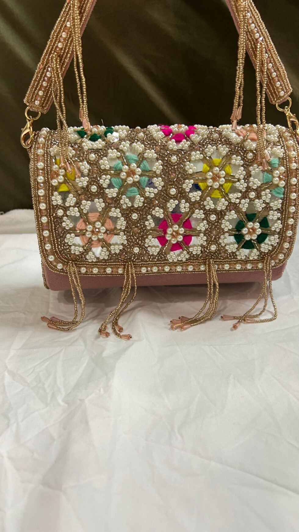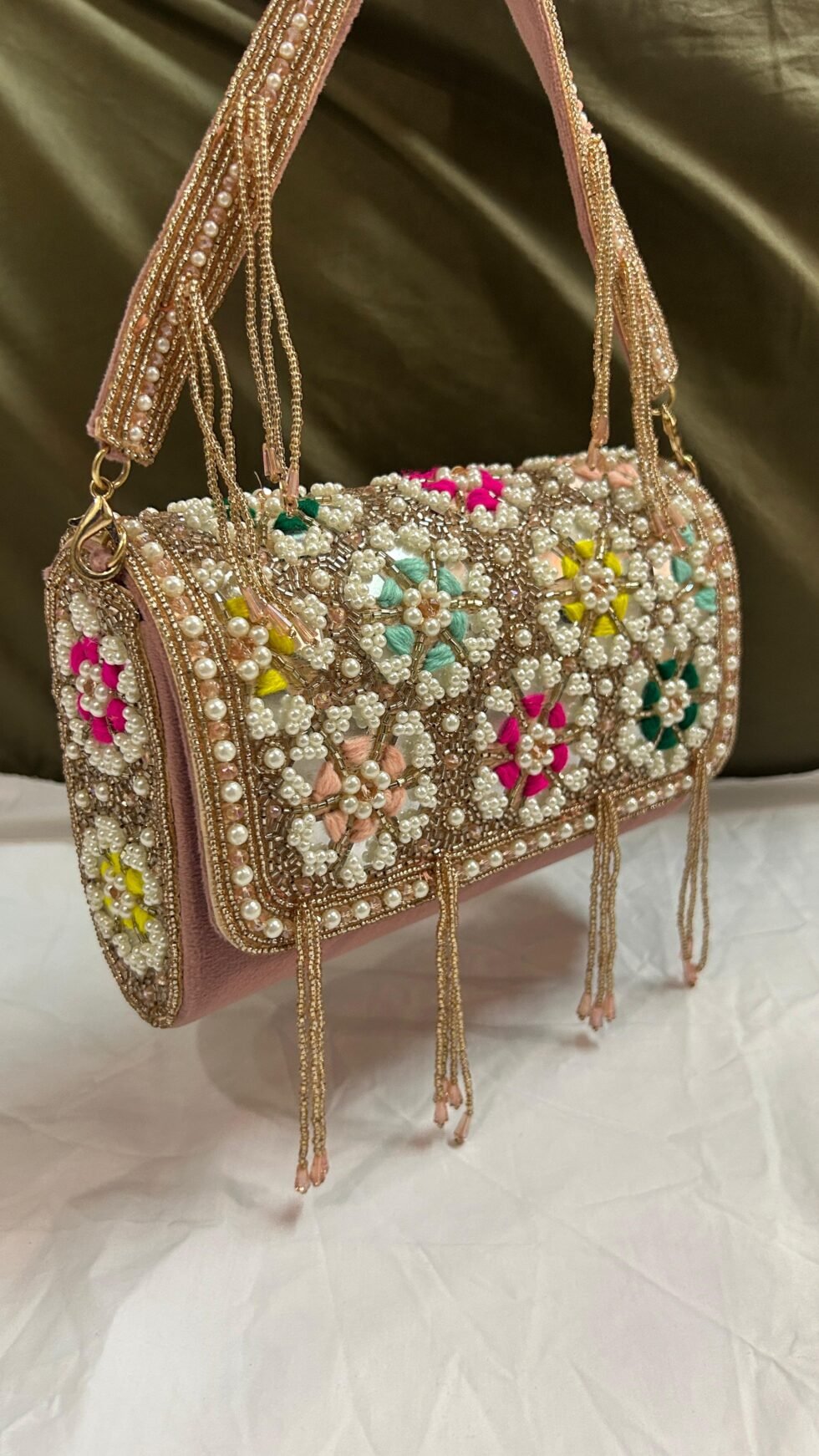 Add grace and handcrafted elegance to your look with this handmade pearl floral beaded shoulder bag. Designed for women who love soft festive styling with visible craft value, this bag beautifully combines pearl embroidery, floral beadwork, delicate pastel thread details, and decorative hanging strands in one rich handcrafted design. The overall look feels feminine, festive, and premium without looking too heavy, which makes it a lovely choice for women who want a statement bag that still feels refined and wearable. The soft blush base and pearl finish give it a classy charm that looks special from the very first glance.