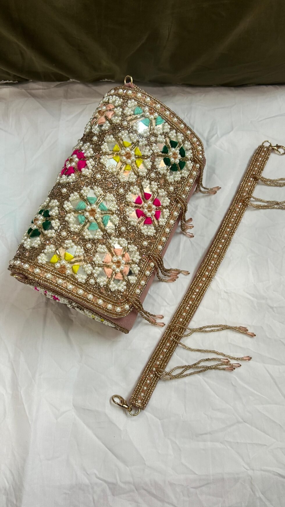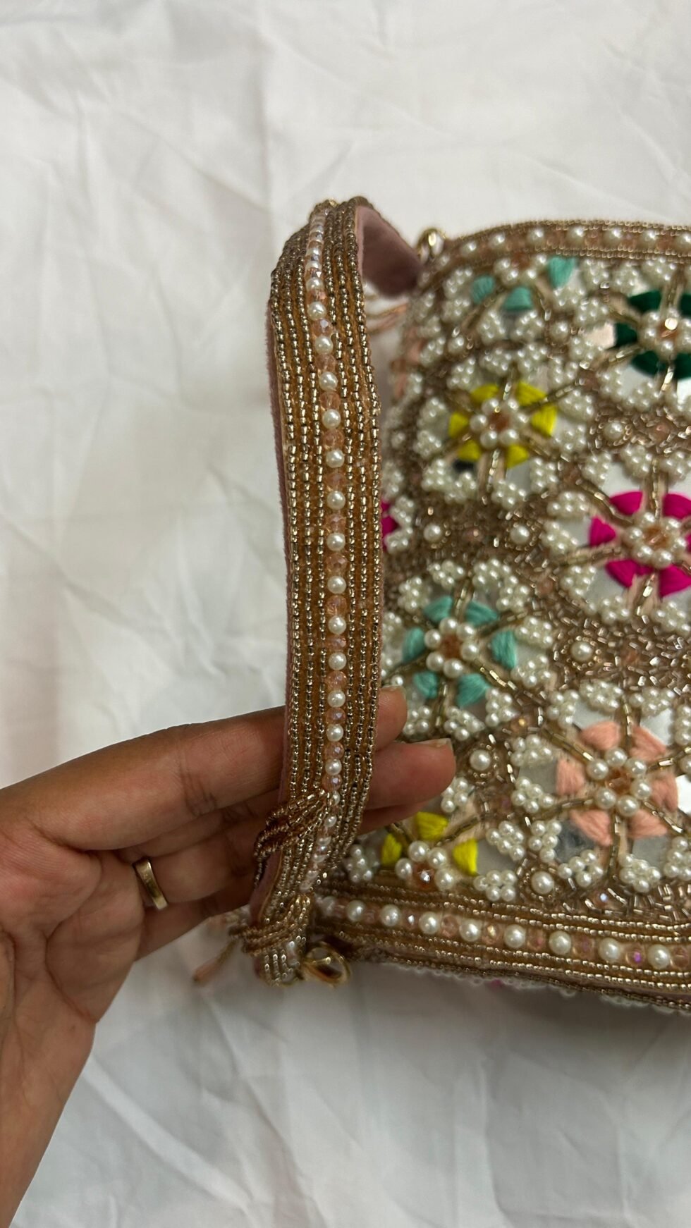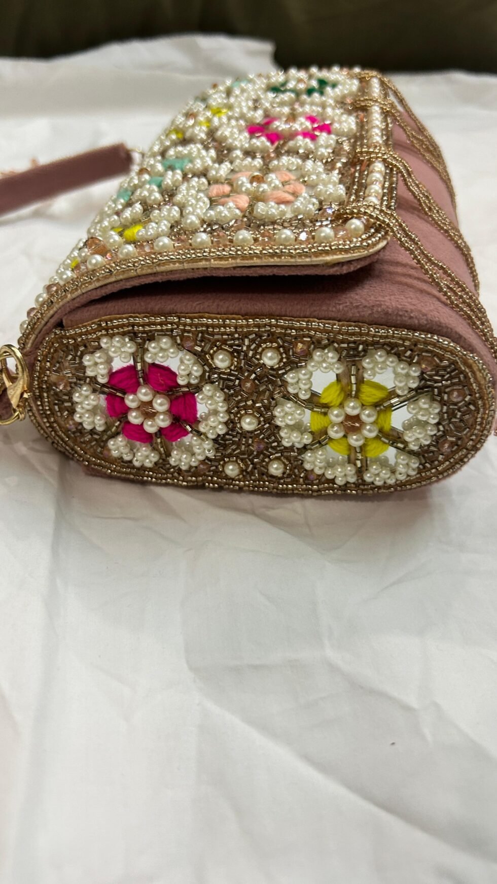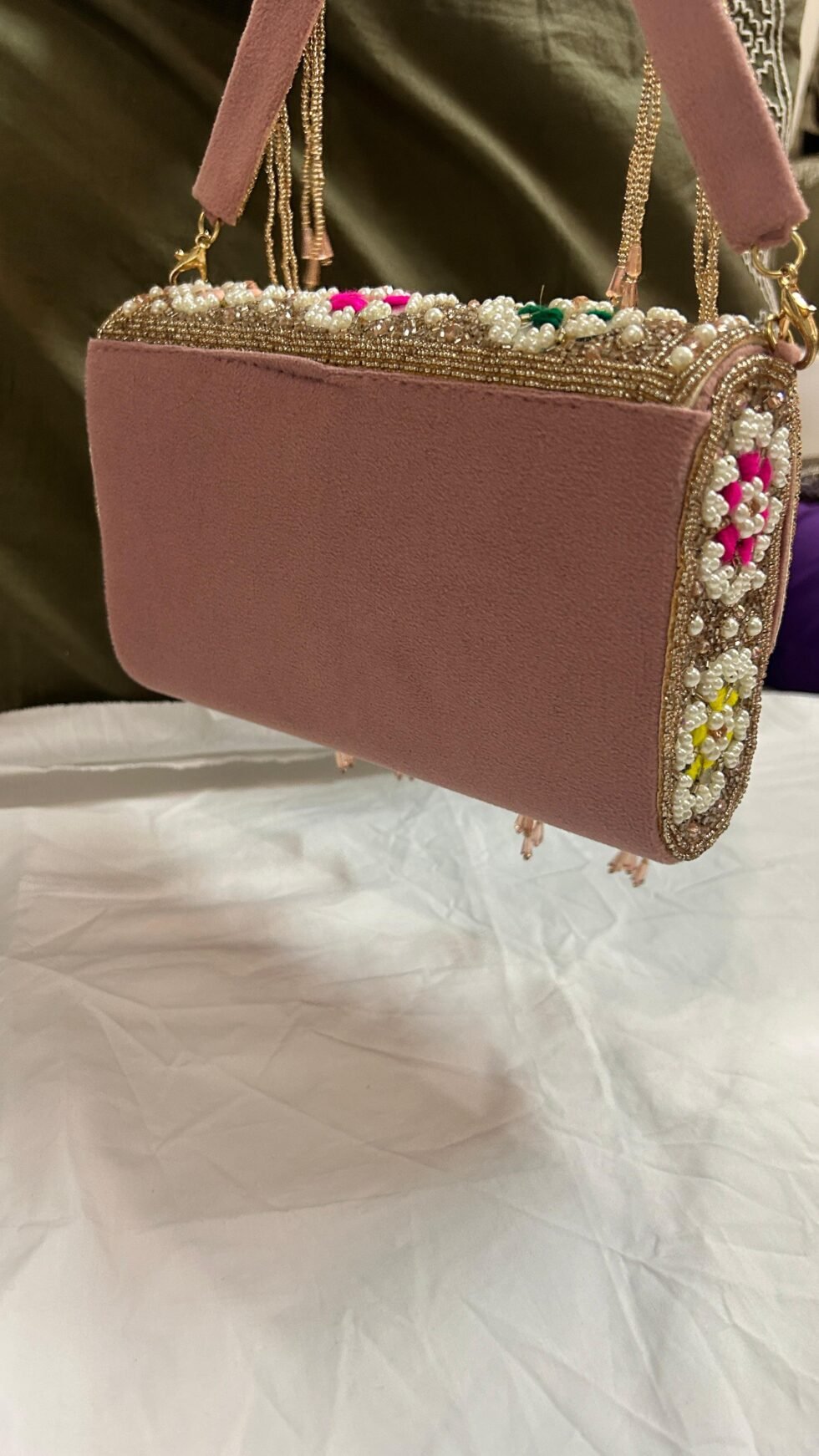Add grace and handcrafted elegance to your look with this handmade pearl floral beaded shoulder bag. Designed for women who love soft festive styling with visible craft value, this bag beautifully combines pearl embroidery, floral beadwork, delicate pastel thread details, and decorative hanging strands in one rich handcrafted design. The overall look feels feminine, festive, and premium without looking too heavy, which makes it a lovely choice for women who want a statement bag that still feels refined and wearable. The soft blush base and pearl finish give it a classy charm that looks special from the very first glance.