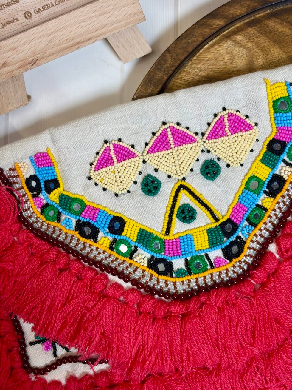 This handmade statement piece is perfect for Navratri nights, garba styling, mehendi celebrations, haldi functions, festive events, wedding functions, cultural programs, vacation shoots, and creative Indo-western outfits. It pairs beautifully with plain kurtis, blouses, chaniya choli, lehenga looks, sarees, dresses, and fusion styling where one strong accessory becomes the highlight of the entire outfit. The bright pink tassels give it a youthful and joyful vibe, while the beadwork and mirror-style accents keep it rooted in traditional Indian handmade beauty. It feels expressive, artistic, and full of celebration, making it a lovely choice for women who want festive jewelry that looks different from regular market pieces.